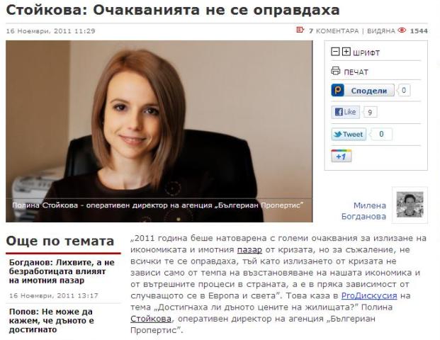 Полина Стойкова: 2011 година беше натоварена с големи очаквания за излизане на икономиката и имотния пазар от кризата, но за съжаление не всички те се оправдаха, тъй като излизането от кризата не зависи само от темпа на възстановяване на нашата икономика и от вътрешните процеси в страната, а е в пряка зависимост от случващото се в Европа и света.