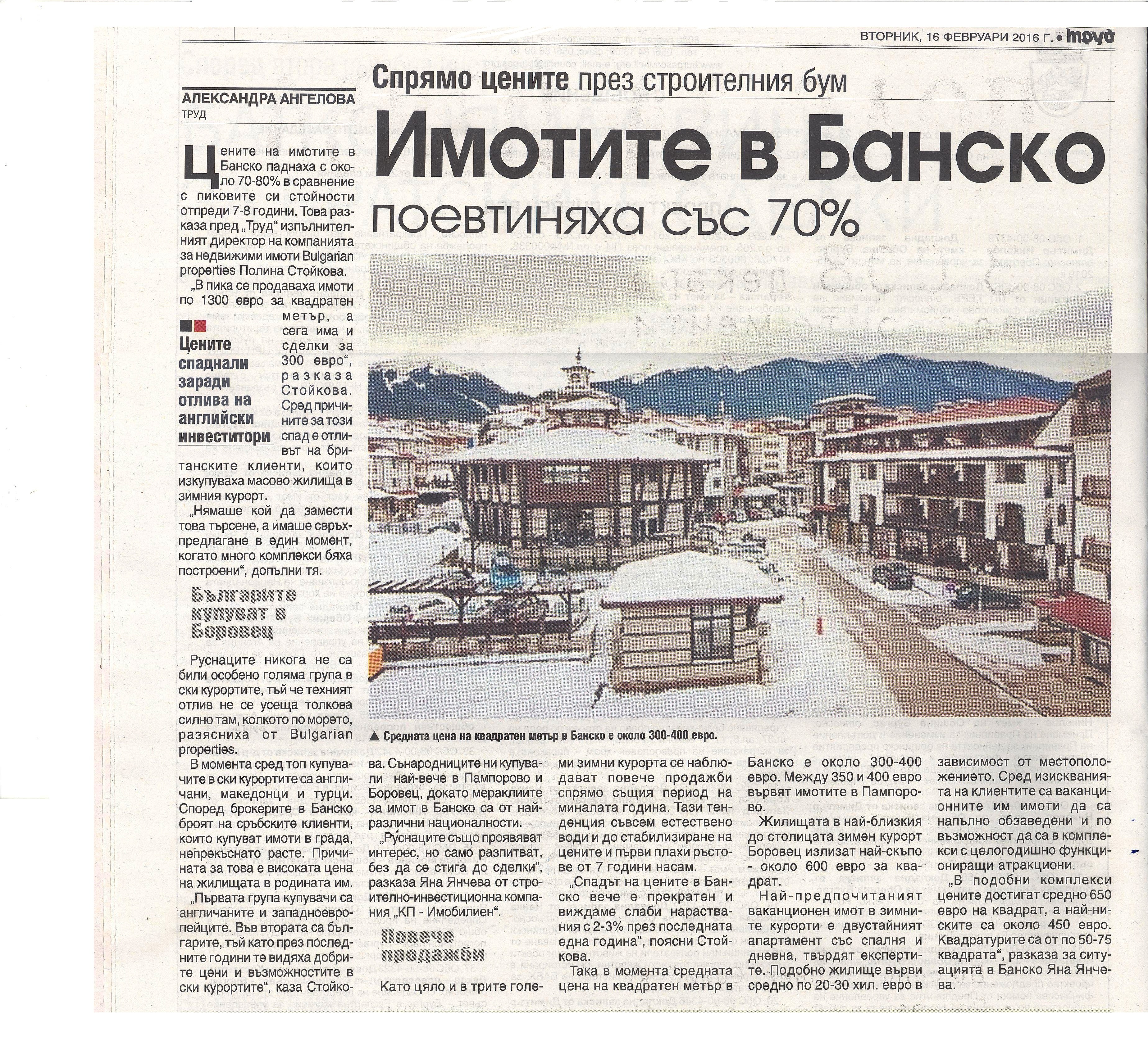 Цените на имотите в Банско паднаха с около 70-80% в сравнение с пиковите си стойности отпреди 7-8 години. Това разказа пред „Труд” изпълнителният директор на компанията за недвижими имоти Bulgarian properties Полина Стойкова. „В пика се продаваха имоти по 1300 евро за квадратен метър, а сега има и сделки за 300 евро”, разказа Стойкова. Сред причините за този спад е отливът на британските клиенти, които изкупуваха масово жилища в зимния курорт. „Нямаше кой да замести това търсене, а имаше свръх-предлагане в един момент, когато много комплекси бяха построени”, допълни тя.