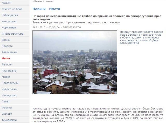 Измина една трудна година за пазара на недвижимите имоти. Цялата 2009 г. беше белязана от спад в обемите, цените, интереса и с увеличаващия се брой оферти на обекти с намалени цени. Данни на агенцията за недвижими имоти Бългериан Пропертис сочат, че през първите единадесет месеца на 2009 г. обемът на сделките в страната е бил с 40% по-малко спрямо същия период на 2008 г.