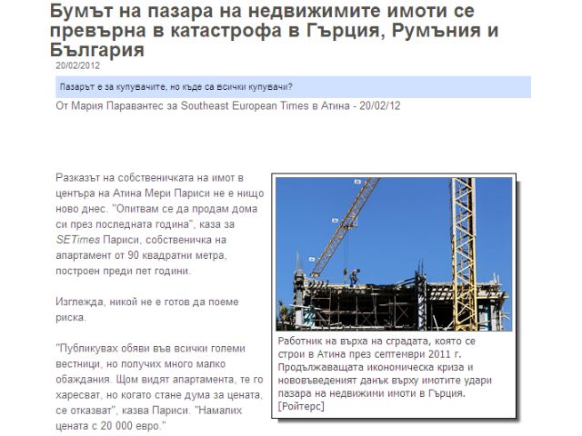 Разказът на собственичката на имот в центъра на Атина Мери Париси не е нищо ново днес. "Опитвам се да продам дома си през последната година", каза за SETimes Париси, собственичка на апартамент от 90 квадратни метра, построен преди пет години. Изглежда, никой не е готов да поеме риска.
