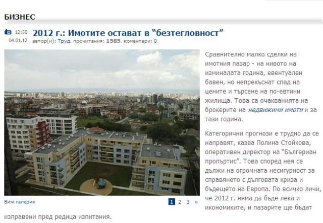 Не е изключено през 2012 г. цените на имотите да продължават да бъдат в „безтегловност” - поради свито търсене и негативни икономически очаквания да продължи техният бавен, но непрекъснат спад казва Полина Стойкова. От друга страна, пазарът вече е установил някакви равновесни за настоящата ситуация нива в отделните ценови сегменти, на които се реализират сделки, и тези нива могат да запазят относителна стабилност. Очаква се обаче допълнително сближаване на офертните цени и цените, на които реално се реализират сделки, тъй като между тях все още има сериозни разминавания.
