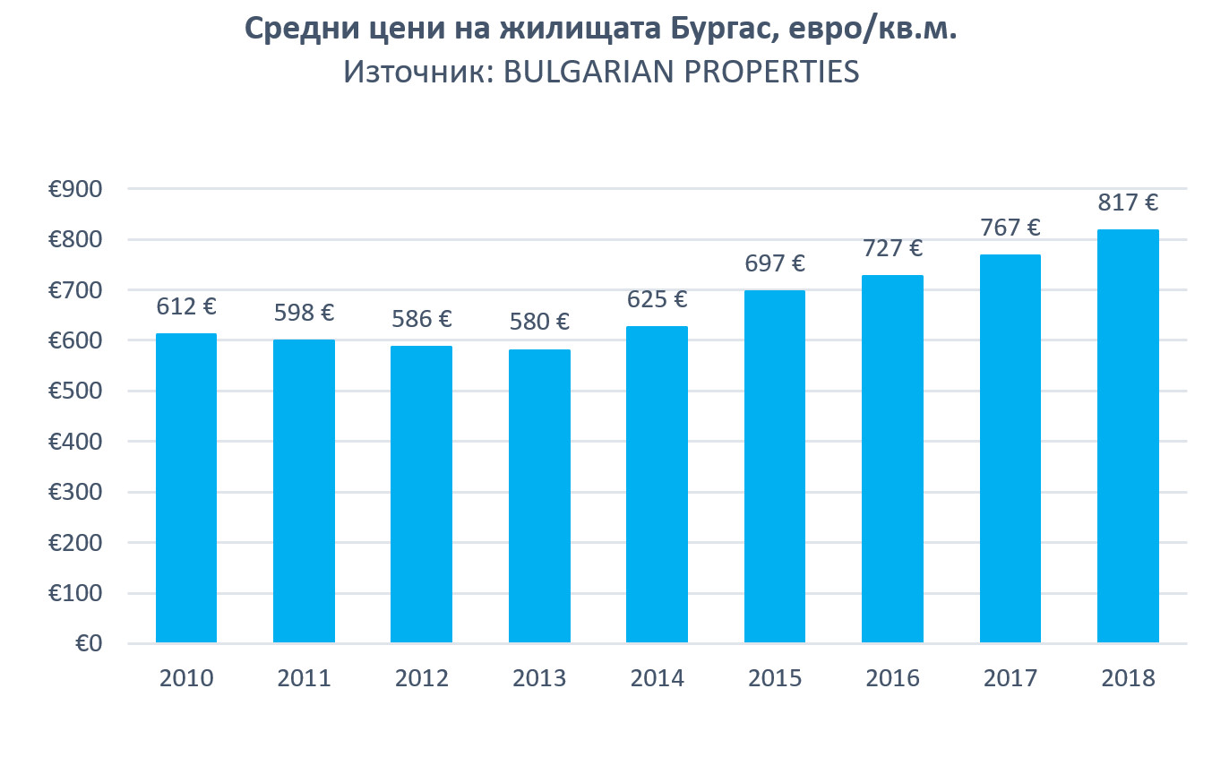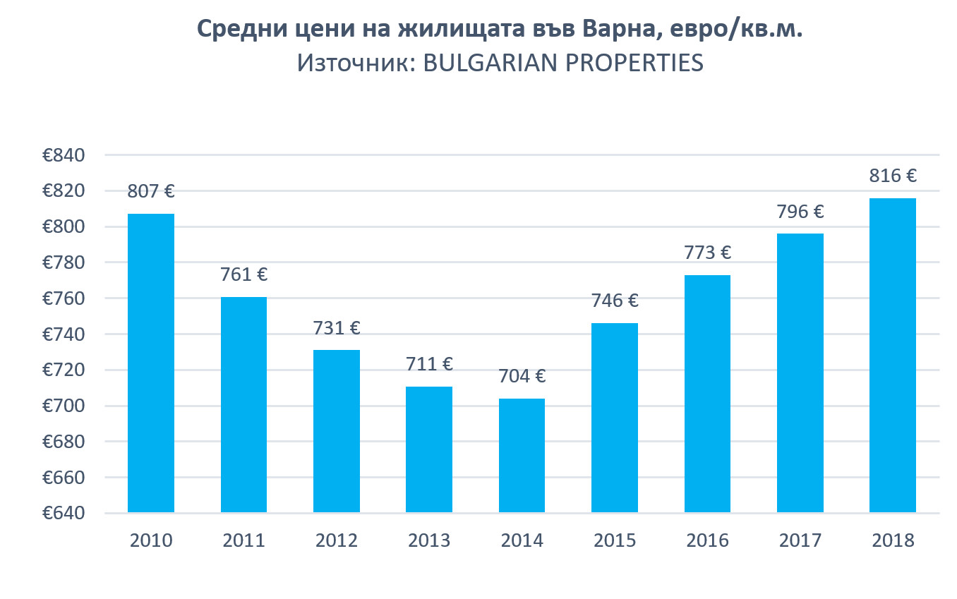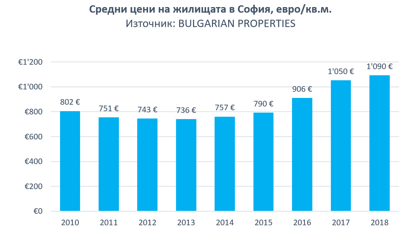 В края на 2017 г. те бяха със средна цена от 636 евро/кв. м, а 12 месеца по-късно цените вече са 724 евро за кв. м. Това представлява повишение от 13.89% за периода.