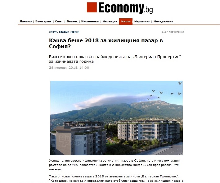 Така описват изминаващата 2018 от агенцията за имоти „Бългериан Пропертис”. "Като цяло, можем да я определим като стабилизираща година за жилищния пазар в столицата“, коментира изпълнителният директор на компанията Полина Стойкова.