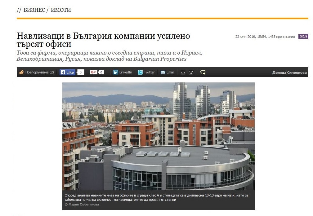 Повишено търсене на пазара на офиси в столицата и засилен интерес към по-големи площи. Това са основните тенденции за първото полугодие на 2016 г. според анализа на агенция Bulgarian Properties. По техни данни обикновено новооткриващите компании търсят по-малки площи до около 200 - 300 кв.м, но все повече фирми търсят и наемат по-големи квадратури от по 700 - 800 кв.м. "Пазарът оперира на по-високи обороти и това се усеща все по-осезаемо", коментира изпълнителният директор Полина Стойкова.