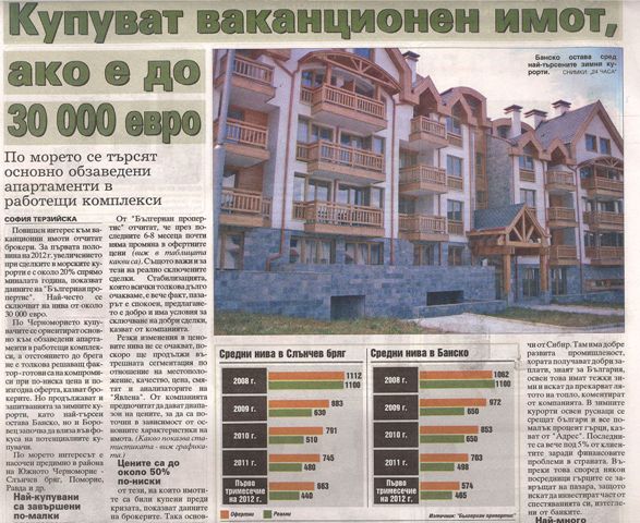 Повишен интерес към ваканционни имоти отчитат брокери. За първата половина на 2012 г. увеличението при сделките в морските курорти е с около 20% спрямо миналата година, показват данните на "Бългериан пропертис". Най-често се сключват на нива от около 30 000 евро.