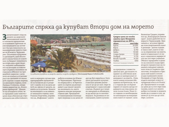 Значителният спад на цените на морските ваканционни имоти и голямото предлагане са основните причини за увеличаването на активността при покупката на ваканционни имоти главно по Южното Черноморие. Основните купувачи са руснаците, като българите изключиха от семейния си бюджет покупката на втори дом край морето, показват наблюденията на агенции за имоти през първата половина на годината. Обемът на продажбите нарасна с началото на сезона и отчитаме ръст на сделките от около 50% спрямо същия период на миналата година, каза Полина Стойкова, оперативен директор на "Бългериан Пропертис".