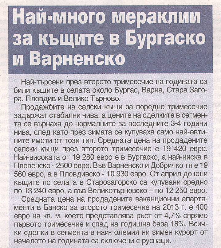 Най-търсени през второто тримесечие на годината са били къщите в селата около Бургас, Варна, Стара Загора, Пловдив и Велико Търново.