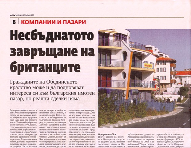 България отново се нареди в Топ 10 на най-популярните пазари на недвижими имоти за британските купувачи през юли, като зае седмото място. Това съобщи британският сайт TheMoveChannel. com, специализиран в продажбата на български имоти. Проверка на в. „Пари" обаче показва, че от интереса до реалната сделка има сериозна разлика. До голяма степен това се дължи на нереалните очаквания на потенциалните купувачи. Не са малко и англичаните, които свързват България с имотния бум преди три години и неизпълнените обещания на брокерите за двуцифрена възвръщаемост на инвестициите им.