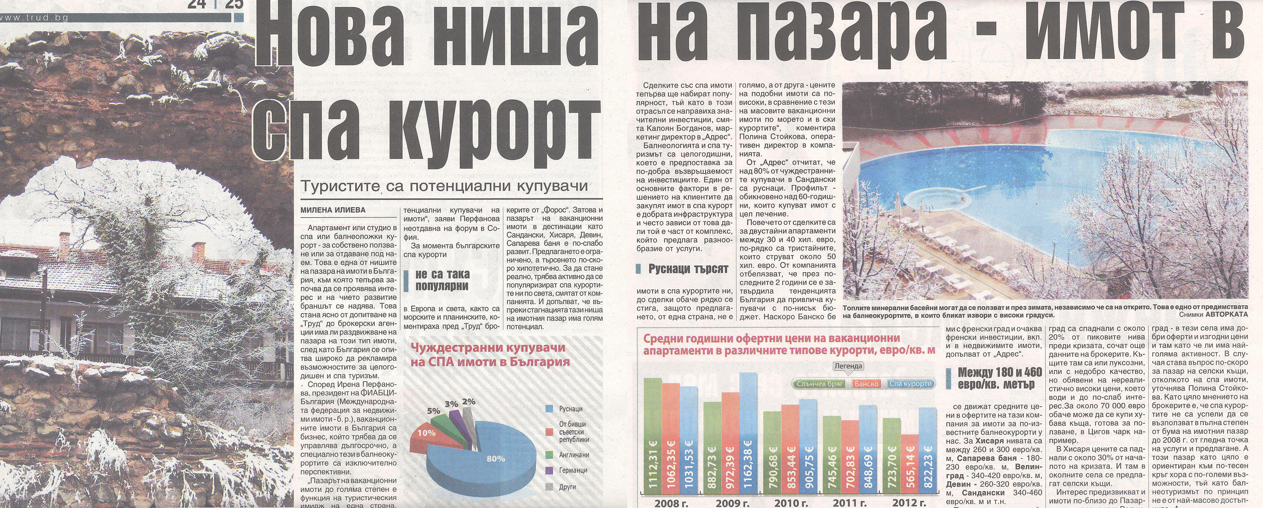 По думите на Полина Стойкова, оперативен директор на BULGARIAN PROPERTIES:"Руснаци търсят имоти в спа курортите ни, до сделки обаче рядко се стига, защото предлагането, от една страна, не е голямо, а от друга - цените на подобни имоти са по-високи, в сравнение с тези на масовите ваканционни имоти по морето и в ски курортите".