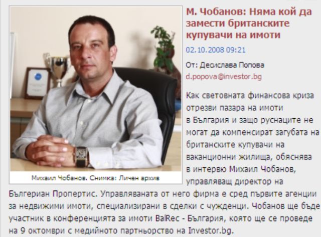 Как световната финансова криза отрезви пазара на имоти в България и защо руснаците не могат да компенсират загубата на британските купувачи на ваканционни жилища, обяснява в интервю Михаил Чобанов, управляващ директор на Бългериан Пропертис. Управляваната от него фирма е сред първите агенции за недвижими имоти, специализирани в сделки с чужденци. Чобанов ще бъде участник в конференцията за имоти BalRec - България, която ще се проведе на 9 октомври с медийното партньорство на Investor.bg.