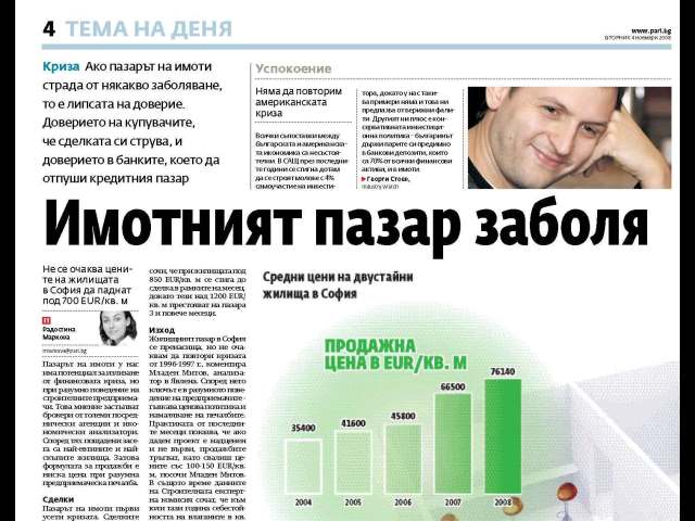 Пазарът на имоти първи усети кризата. Сделките рязко намаляха още от април насам, докато кредитите забавиха темпото едва през последните месеци, обобщи управителят на агенция Явлена Страхил Иванов. Купувачите са малко заради трудното кредитиране и психологическия страх от сделка. Може да се каже, че пазарът боледува от липса на доверие - както в банковата система, така и сред крайните потребители, смятат от Явлена. По тази причина от лятото насам агенцията отчита 20% ръст на сделките за наем за сметка на спад при покупките на имоти. В подкрепа на това са и последните данни на Агенцията по вписванията, които сочат 21% по-малко продажби на имоти в София за юли - септември. Според брокерите това ще повлече надолу и сделките за цялата година.
