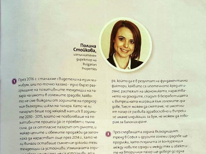 Капитал интервюира експерти от водещи компании за недвижими имоти относно случващото се на пазара и тенденциите за следващата година. На въпросите на икономическия ежедневник отговори Изпълнителния директор на BULGARIAN PROPERTIES Полина Стойкова MRICS