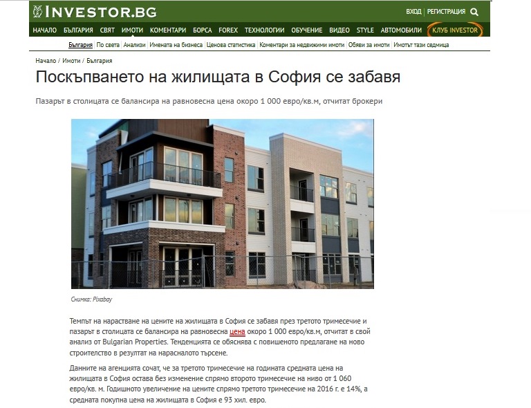 Данните на агенцията сочат, че за третото тримесечие на годината средната цена на жилищата в София остава без изменение спрямо второто тримесечие на ниво от 1 060 евро/кв. м. Годишното увеличение на цените спрямо третото тримесечие на 2016 г. е 14%, а средната покупна цена на жилищата в София е 93 хил. евро.