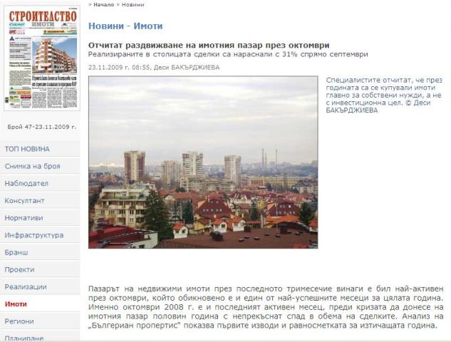 Данните на компанията сочат, че активността на пазара през октомври 2009 г. като цяло е бил с 31% по-висока спрямо септември 2009 г. под формата на реализирани покупко-продажби. Впечатляващо е, че в последната седмица на миналия месец са сключени 30% от общия брой сделки за месеца. Така октомври се е очертал като вторият по активност през настоящата година след юни.