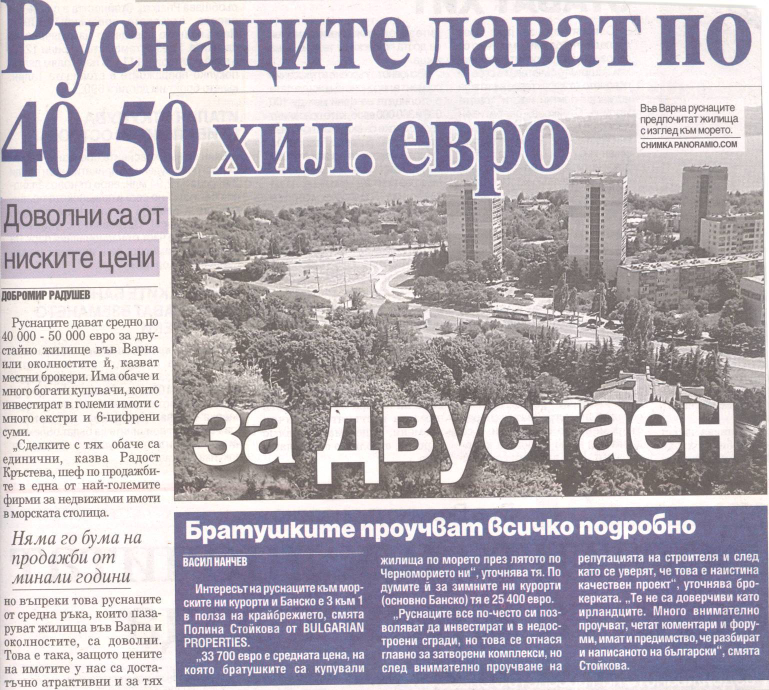 „Руснаците все по-често си позволяват да инвестират и в сгради в процес на строителство, но това се отнася главно за затворени комплекси, но след внимателно проучване на репутацията на строителя и след като се уверят, че това е наистина качествен проект”, уточнява Стойкова.