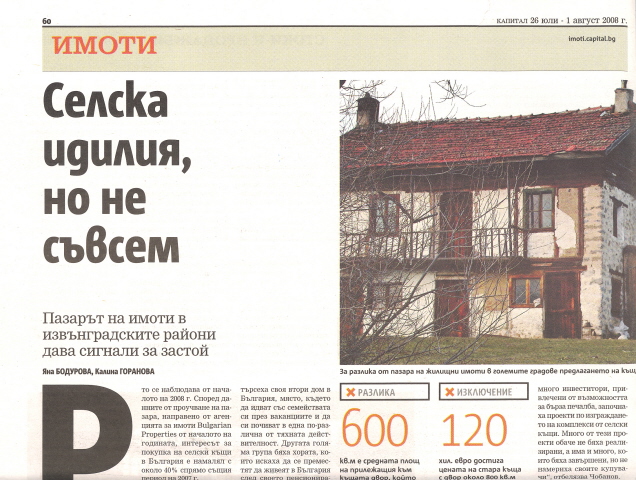 "Този пазар преживя осезаем пик през периода 2004-2007 г., като цената на някои имоти се покачи над пет пъти за този период. Сега определено се наблюдава спад в търсенето, но за осезаеми корекции в цените още е рано да се говори", посочва Даниела Коцова от агенция Мирела. Според нея причина за това е недостатъчно добре развитият вторичен пазар на селски имоти в България. "Чужденците и чуждестранните инвеститори се отказват вече от покупката на имот на село и се прехвърлят към райони с по-висока доходност. Предполагам, че са очаквали доста по-голяма печалба от тази, която получиха, или лошата инфраструктура, канализация и липса на медицински персонал ги е отрезвила от романтичната представа за живот в планината", обяснява Коцова.