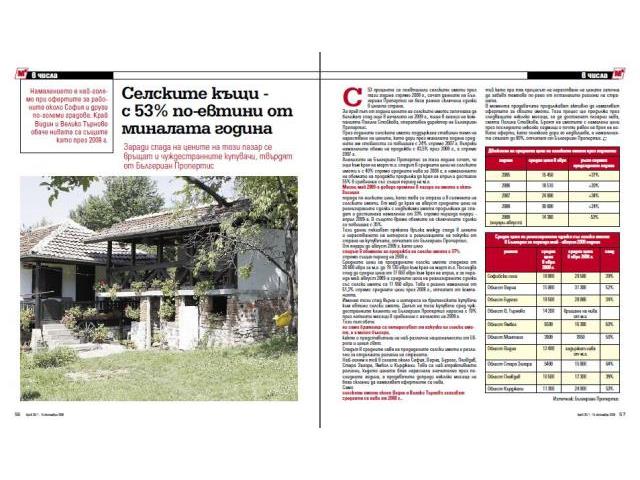 Анализите на Бългериан Пропертис за тази година сочат, че още към края на март т.г. спадът в средните цени на селските имоти е с 40% спрямо средните нива за 2008 г, а намалението на обемите на продажби продължи до края на април и достигна 55% в сравнение със същия период на м.г.