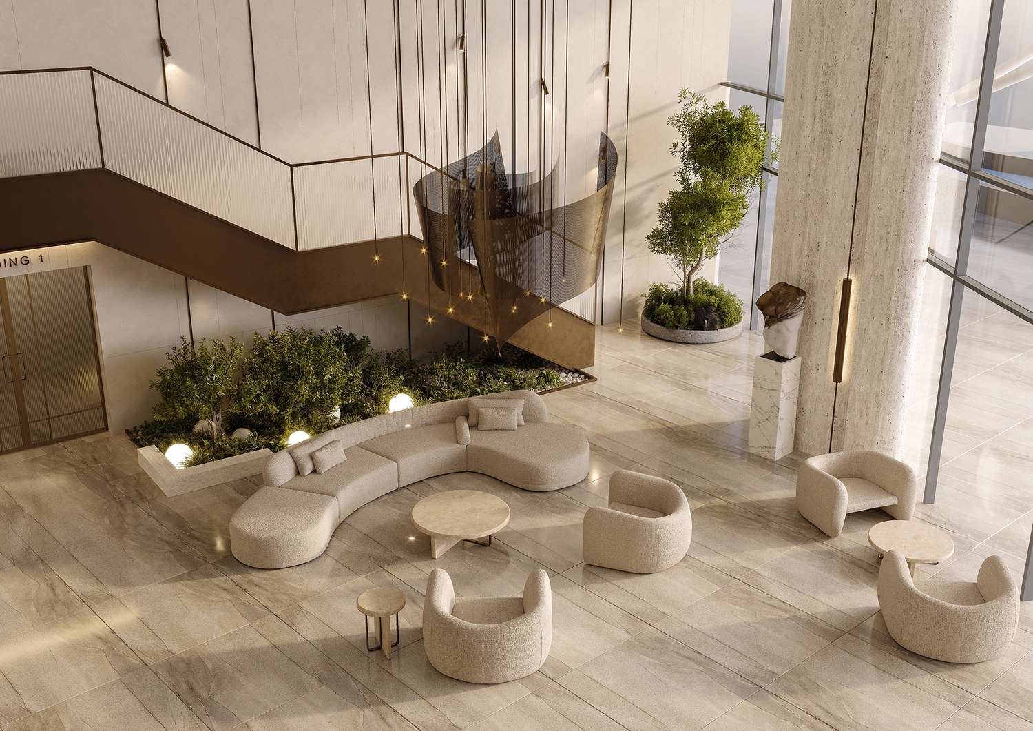 Панорамни стъклени фасади, високи тавани и 360градусови гледки ще осигуряват усещане за простор и светлина. Фасадите използват композитни панели, широкоформатен гранитогрес и окачени стъклени системи, които придават дълбочина и визуален ритъм.