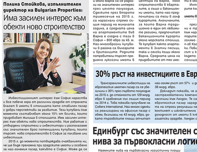 „Инвестиционният интерес към София нараства и все повече хора от различни градове от страната влагат в имоти в столицата като стабилен пазар с добри перспективи за развитие. Тези купувачи към момента съставляват около 15% от всички, които придобиват жилища в столицата. Има засилен интерес към обекти ново строителство“, съобщи Полина Стойкова, изпълнителен директор на BULGARIAN PROPERTIES, за вестник „Строител“.