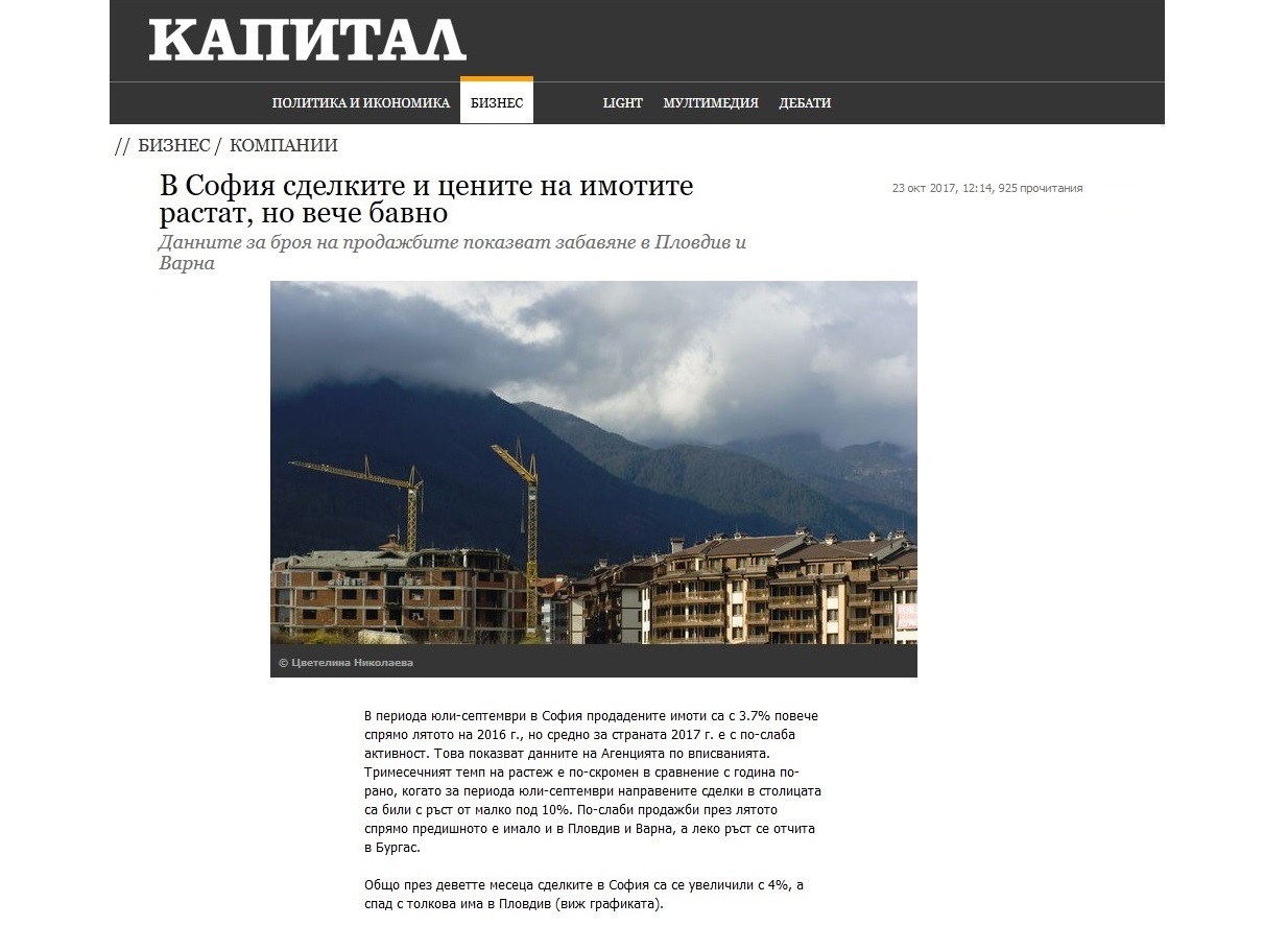 В периода юли-септември в София продадените имоти са с 3.7% повече спрямо лятото на 2016 г., но средно за страната 2017 г. е с по-слаба активност. Това показват данните на Агенцията по вписванията. Тримесечният темп на растеж е по-скромен в сравнение с година по-рано, когато за периода юли-септември направените сделки в столицата са били с ръст от малко под 10%. По-слаби продажби през лятото спрямо предишното е имало и в Пловдив и Варна, а леко ръст се отчита в Бургас.
