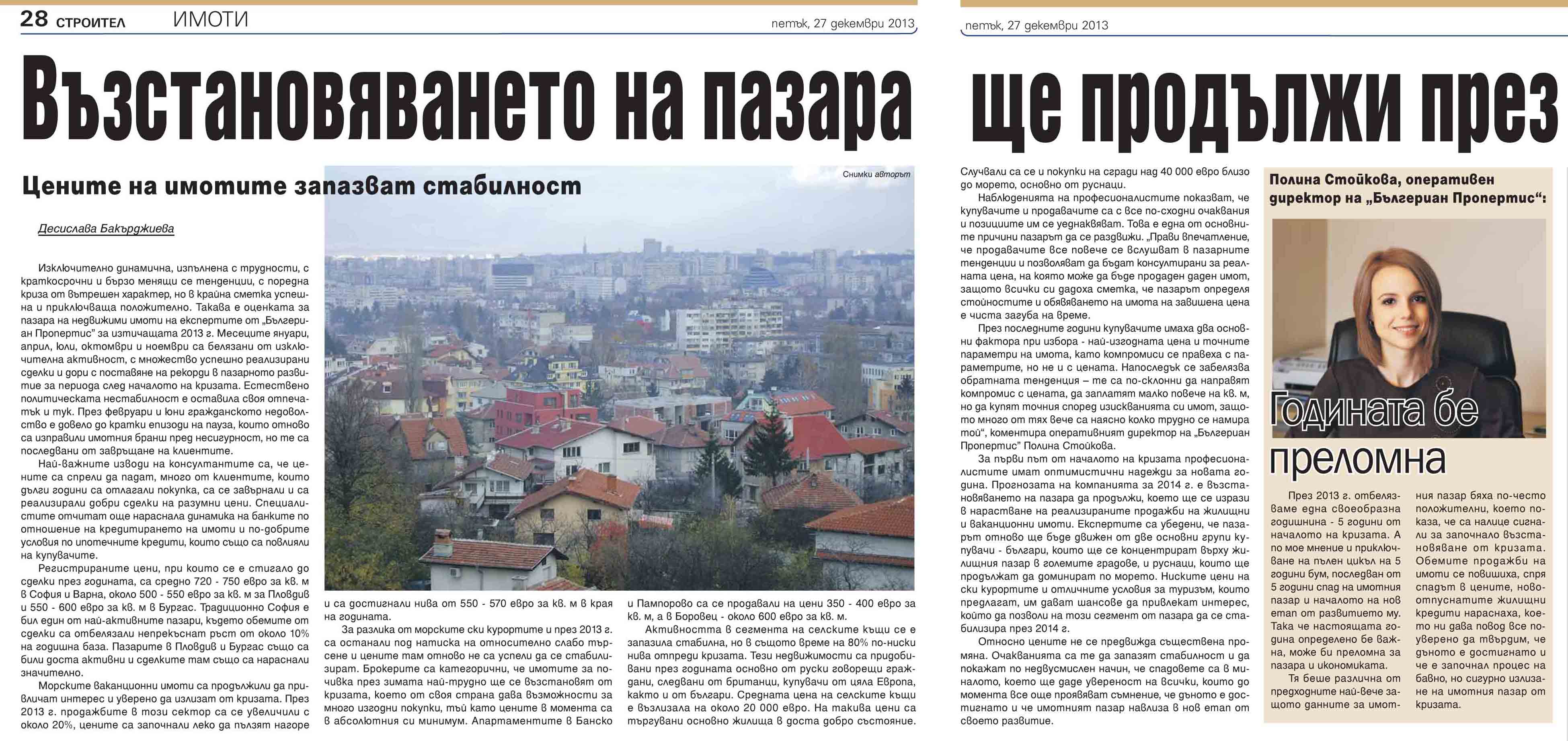 Изключително динамична, изпълнена с трудности, с краткосрочни и бързо менящи се тенденции, с поредна криза от вътрешен характер, но в крайна сметка успешна и приключваща положително. Такава е оценката за пазара на недвижими имоти на експертите от „Бългериан Пропертис" за изтичащата 2013 г. Месеците януари, април, юли, октомври и ноември са белязани от изключителна активност, с множество успешно реализирани сделки и дори с поставяне на рекорди в пазарното развитие за периода след началото на кризата. Естествено политическата нестабилност е оставила своя отпечатък и тук. През февруари и юни гражданското недоволство е довело до кратки епизоди на пауза, които отново са изправили имотния бранш пред несигурност, но те са последвани от завръщане на клиентите.