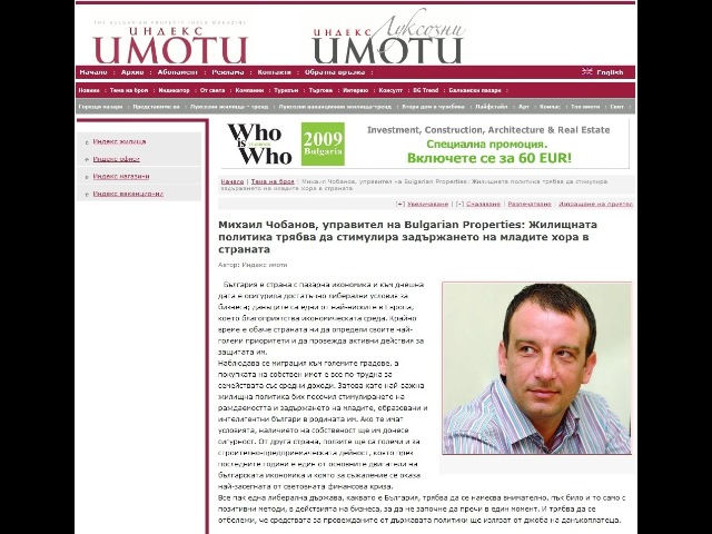Наблюдава се миграция към големите градове, а покупката на собствен имот е все по-трудна за семействата със средни доходи. Затова като най-важна жилищна политика бих посочил стимулирането на раждаемостта и задържането на младите, образовани и интелигентни българи в родината им. Ако те имат условията, наличието на собственост ще им донесе сигурност. От друга страна, ползите ще са големи и за строително-предприемаческата дейност, която през последните години е един от основните двигатели на българската икономика и която за съжаление се оказа най-засегната от световната финансова криза.