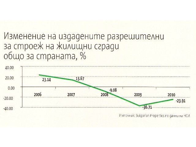 Въпреки увеличеното ипотечно кредитиране (8.4% ръст през 2010 г. спрямо 2009 г. по данни на БНБ) и все по-изгодните лихви, които достигнаха нива отпреди кризата, жилищните сделки засега продължават да намаляват (7% спад през 2010 г. спрямо 2009 г.). Въпреки че цените на жилищата се върнаха на нивата от 2005 г. и макар и със забавени темпове да продължават надолу (по данни на НСИ), несигурната икономическа обстановка и опасенията от втора рецесия в световен мащаб кара хората да се въздържат от купуването на нови.