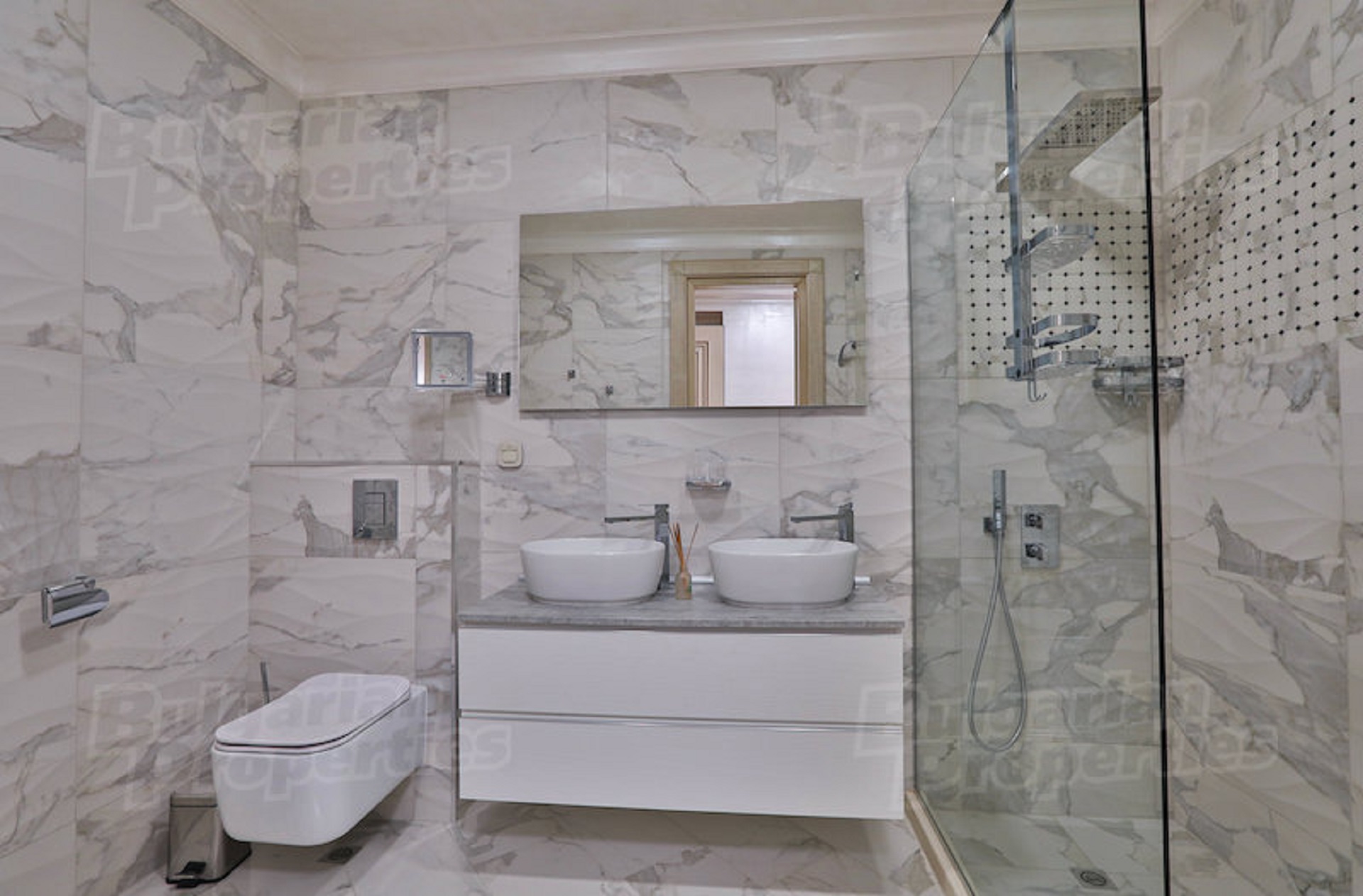 Всички бани в сградата са различни, по индивидуален интериорен дизайн и с подово отопление. В допълнение може да закупите подземно паркомясто на цена 800 евро/кв. м.