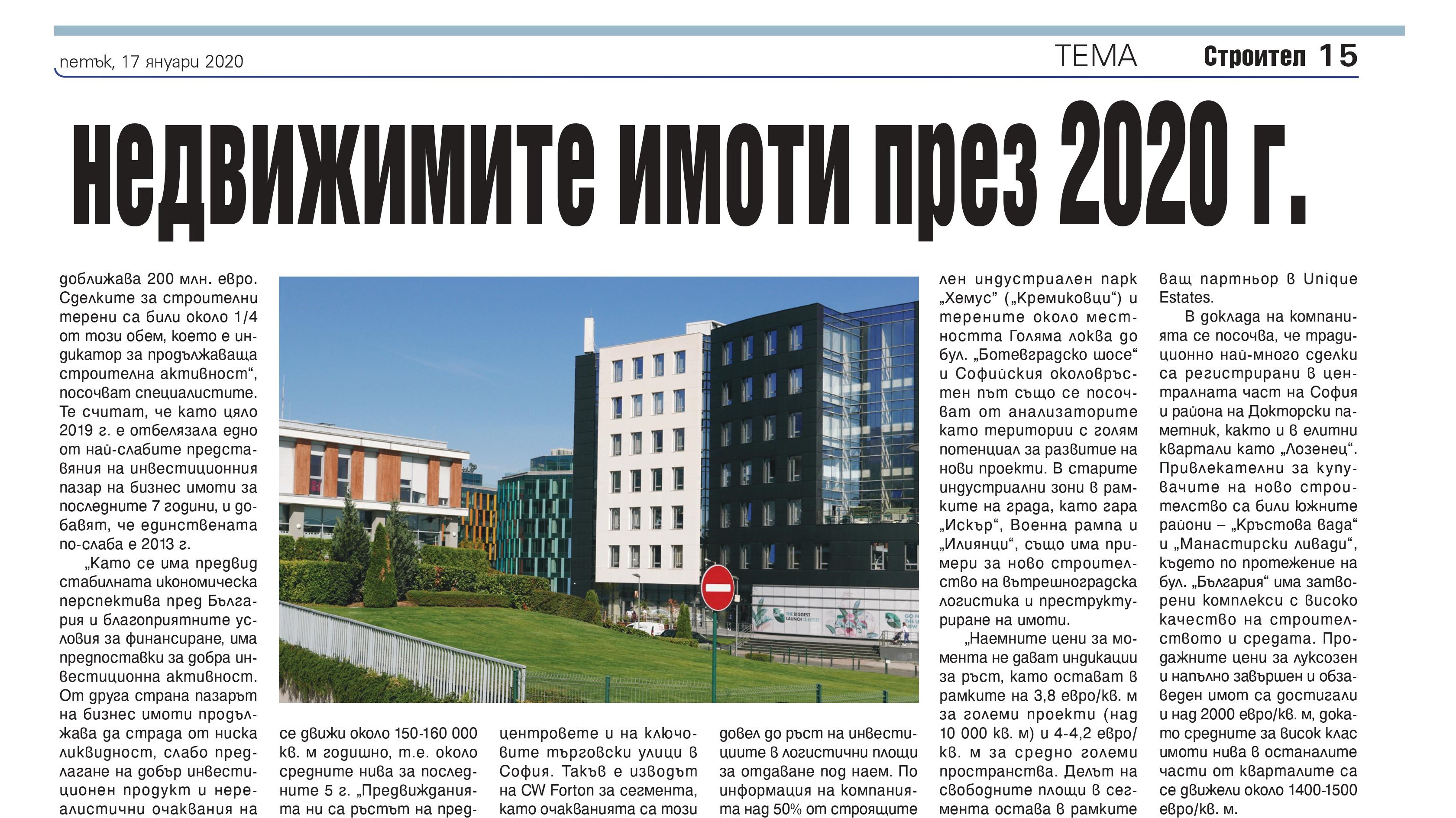 Пазарът на недвижимите имоти отбеляза динамичен край на 2019 г. и силно начало на 2020 г. Това сочат обзорните анализи на водещи компании в сферата. Равносметката за изминалата година е стабилен жилищен сегмент с повече реализирани продажби спрямо предходната, ръст на инвестициите в офиси и логистични обекти, недостиг на нови площи в търговските центрове и висока наемна активност, както и отрезвяване на пазара на луксозни имоти. Прогнозите са, че 2020 г. ще бъде много подобна на 2019 г. – без съществена промяна в ценовите нива и с умерена инвестиционна активност.