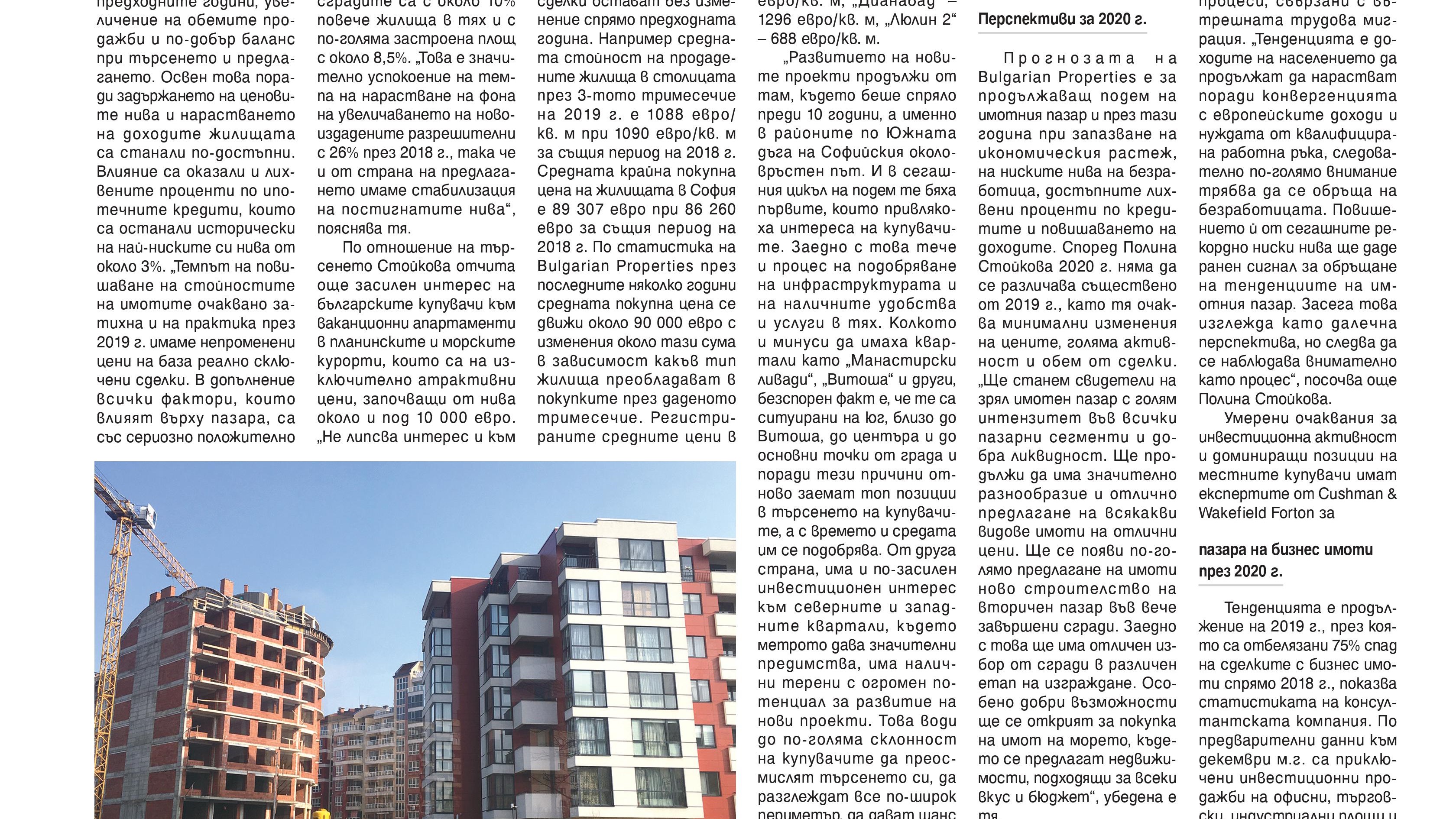 Прогнозата на Bulgarian Properties е за продължаващ подем на имотния пазар и през тази година при запазване на икономическия растеж, на ниските нива на безработица, достъпните лихвени проценти по кредитите и повишаването на доходите. Според Полина Стойкова 2020 г. няма да се различава съществено от 2019 г., като тя очаква минимални изменения на цените, голяма активност и обем от сделки. „Ще станем свидетели на зрял имотен пазар с голям интензитет във всички пазарни сегменти и добра ликвидност. Ще продължи да има значително разнообразие и отлично предлагане на всякакви видове имоти на отлични цени. Ще се появи по-голямо предлагане на имоти ново строителство на вторичен пазар във вече завършени сгради. Заедно с това ще има отличен избор от сгради в различен етап на изграждане. Особено добри възможности ще се открият за покупка на имот на морето, където се предлагат недвижимости, подходящи за всеки вкус и бюджет“, убедена е тя.