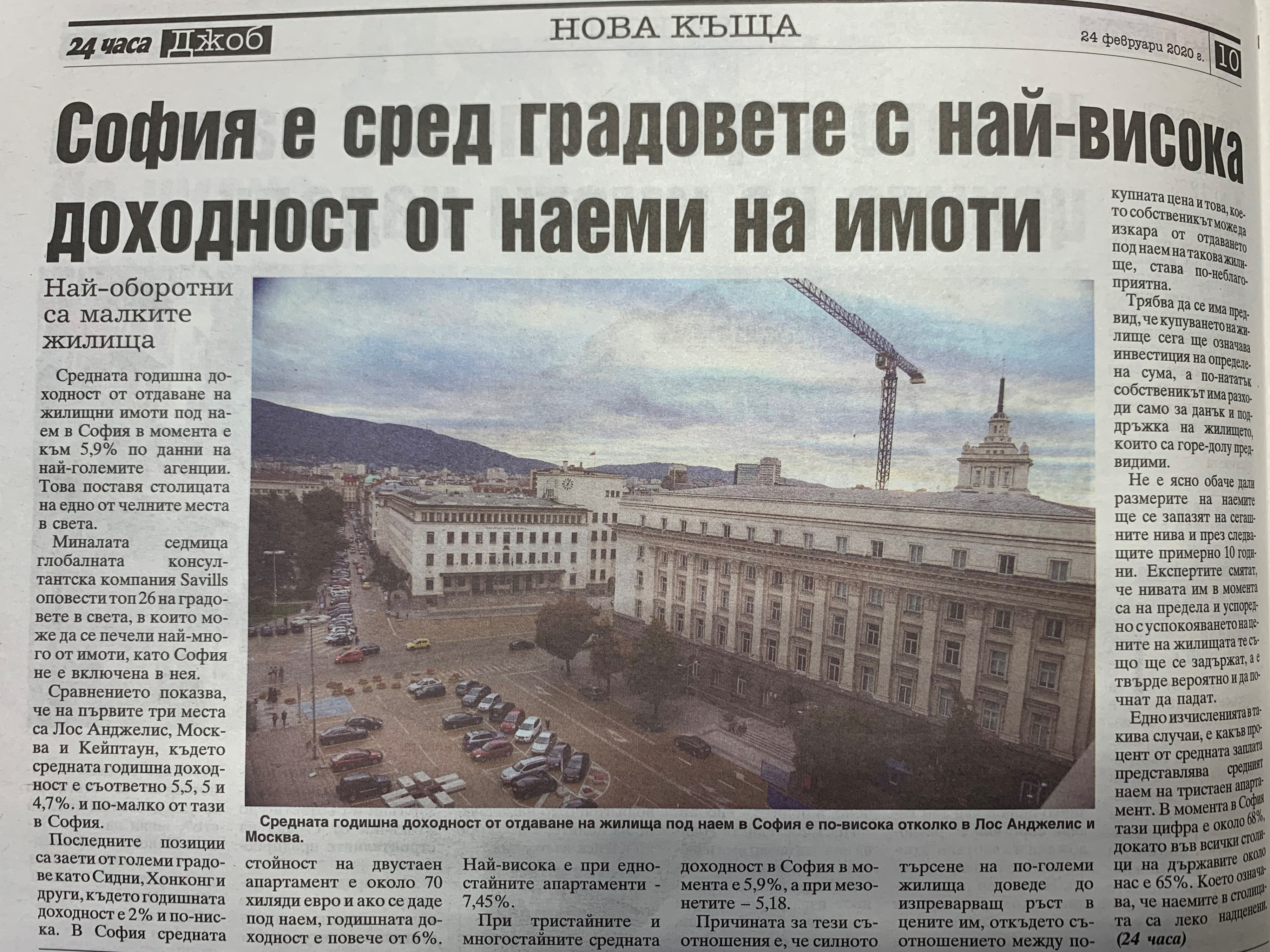 Миналата седмица глобалната консултантска компания Savills оповести топ 26 на градовете в света, в които може да се печели най-много от имоти, като София не е включена в нея. Сравнението показва, че на първите три места са Лос Анджелис, Москва и Кейптаун, където средната годишна доходност е съответно 5,5, 5 и 4,7%, и по-малко от тази в София.