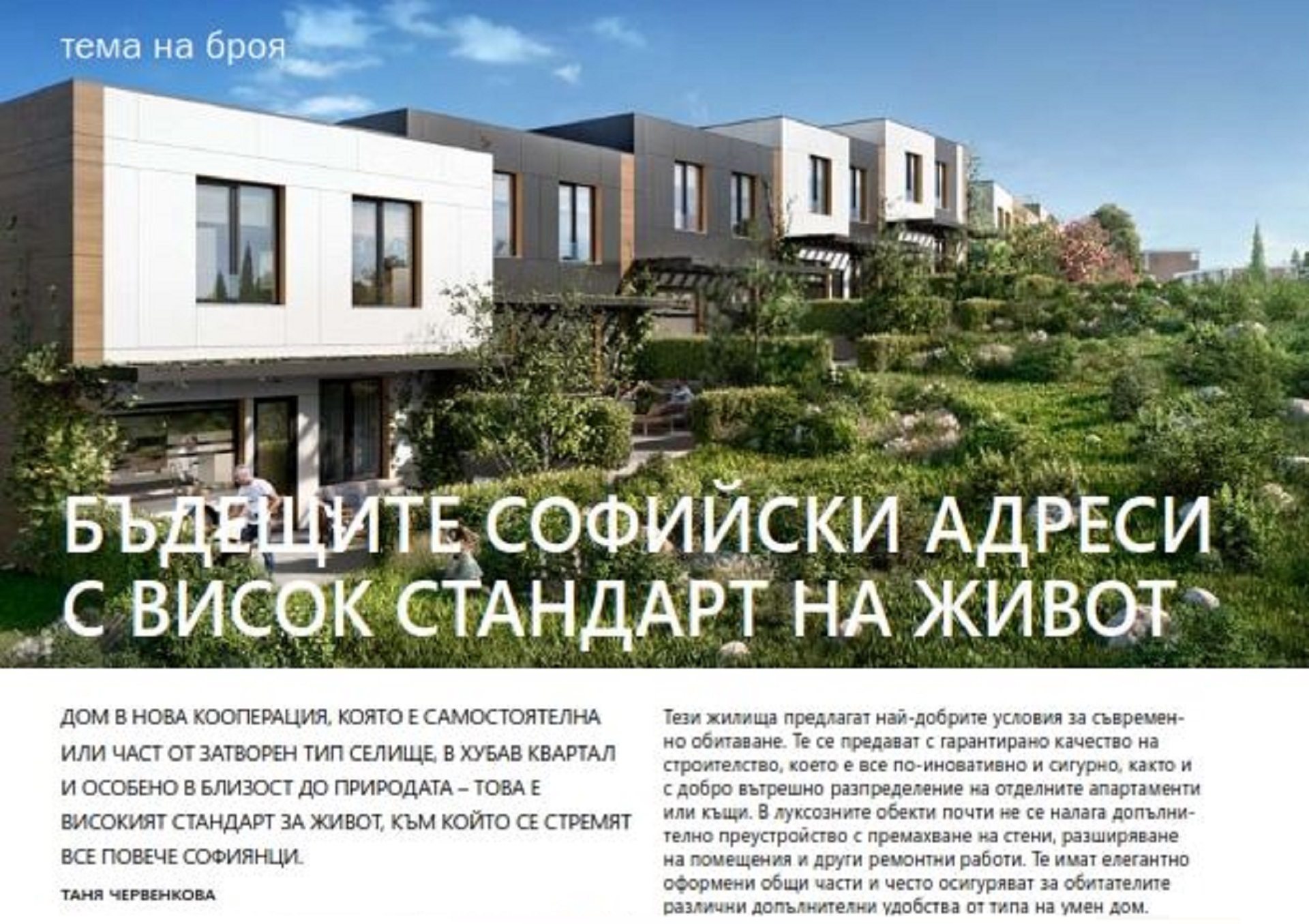 Дом в нова кооперация, която е самостоятелна или част от затворен тип селище, в хубав квартал и особено в близост до природата – това е високият стандарт за живот, към който се стремят все повече софиянци.