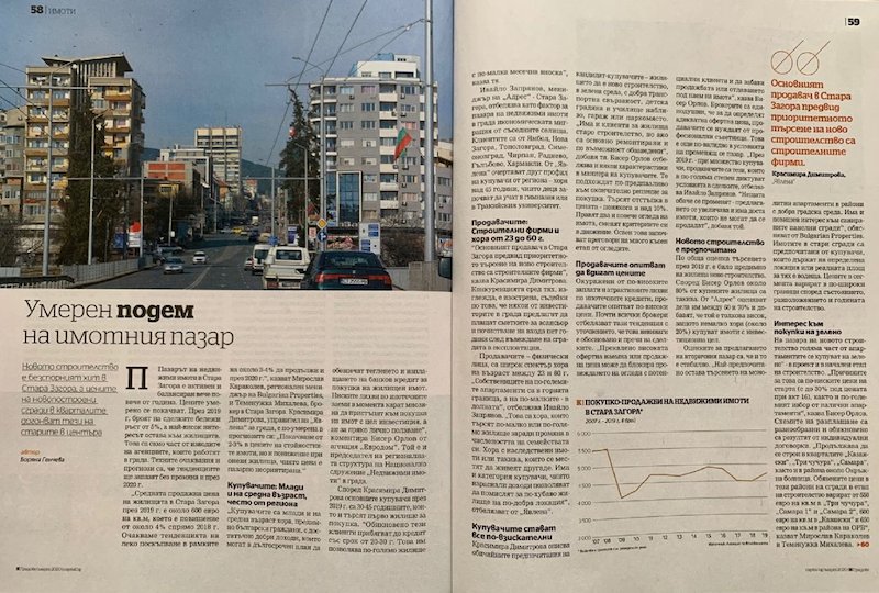 Пазарът на недвижими имоти в Стара Загора е активен и балансиран вече повече от година. Цените умерено се покачват. През 2019 г. броят на сделките бележи ръст от 5%, а най-висок интересът остава към жилищата. Това са само част от изводите на агенциите, които работят в града. Техните очаквания и прогнози са, че тенденциите ще запазят без промяна и през 2020 г.
