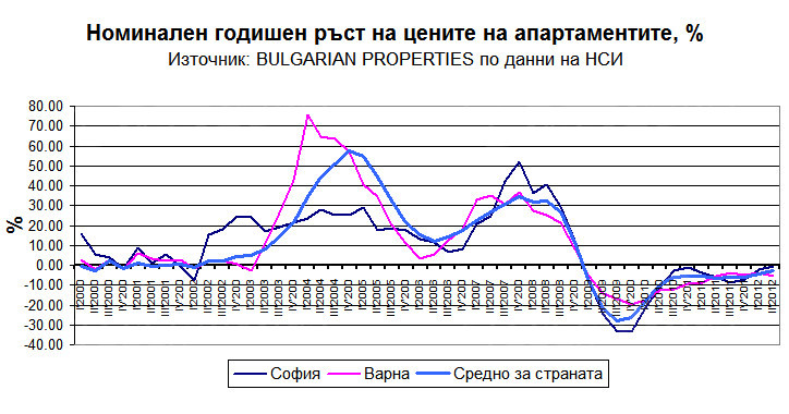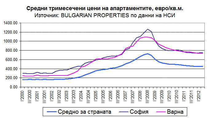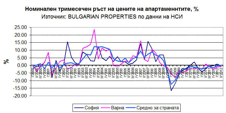 Според данните на НСИ цените на апартаментите в София през 2-то тримесечие на 2012 г. са спаднали номинално с -0.54% спрямо предходното тримесечие, а на годишна база спадът е -0.57%. След отчитане на инфлация (чрез ХИПЦ) цените на апартаментите в София са спаднали с -0.82% спрямо предходното тримесечие и с -2.36% спрямо същия период на миналата година.