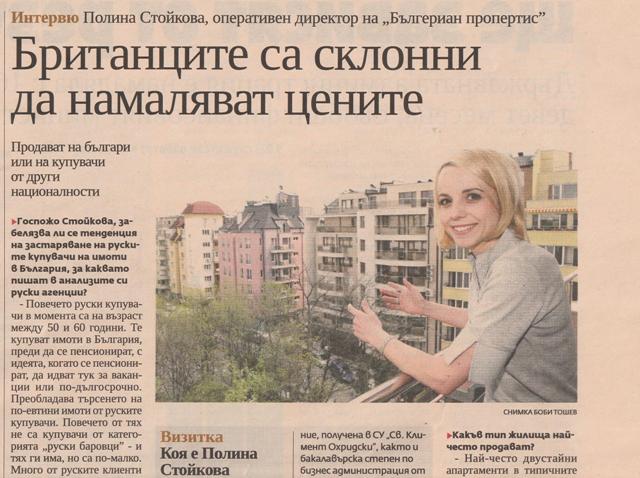В статия на в. Пари от 22 април 2010 г. озаглавена "Англичаните масово продават имотите си" Оперативният директор на БЪЛГЕРИАН ПРОПЕРТИС Полина Стойкова коментира, че англичаните продават имотите си на българи или на купувачи от други националности.