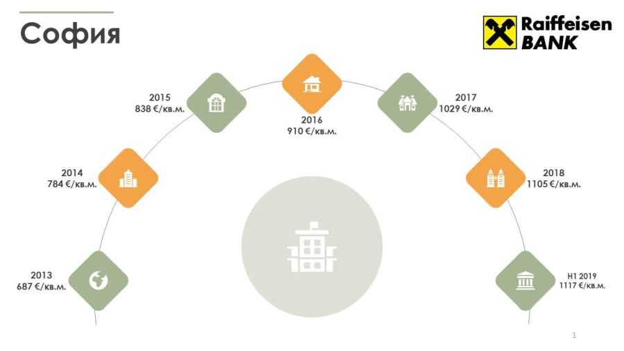 Според анализа на Райфайзенбанк и данните от индексите PSPI, средната цена на кв. м. жилищна площ в София през първото полугодие на тази година достига 1 117 евро спрямо 1 105 евро през 2018 г. (натрупан ръст от 62% спрямо 2013 г.).