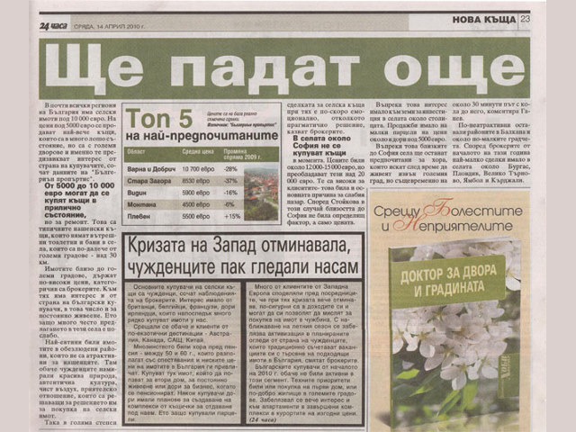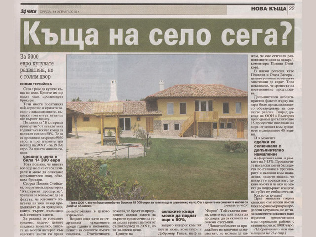 В броя си от 14 април 2010 г. в. 24 часа публикува анализа на БЪЛГЕРИАН ПРОПЕРТИС за пазара на селски имоти през последната година. В статията Оперативният директор на компанията Полина Стойкова споделя, че селските имоти поевтиняха най-сериозно в кризата заедно с ваканционните, но въпреки това ще вървят още надолу.