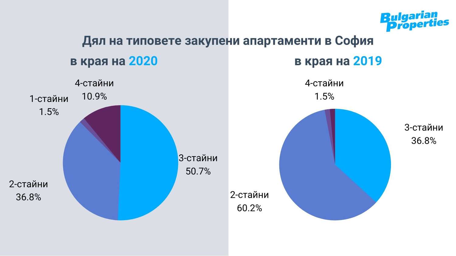 Тристайните апартаменти категорично изместиха двустайните при продажбите в нашата агенция, добави Стойкова. Делът на тристайните апартаменти от сделките в Bulgarian Properties през последната четвърт на 2020 г. се е увеличил до 51% при 37% през същия период година по-рано. Делът на двустайните е паднал от 60% на 37%. Сделките с едностайни остават 1.5% от всички. Особено показателно е случващото се при четиристайните жилища, чийто дял нараства от 1.5% на 11%. "Очевидна е нуждата от повече площ. В момента се цени да има още едно помещение, което да е затворено - било то за кабинет или за стая за онлайн обучение. Някои хора предпочитат и отделна кухня, но тогава трябва да се търси при старото или при панелното строителство, понеже новото най-често не предлага такава", добави Полина Стойкова.