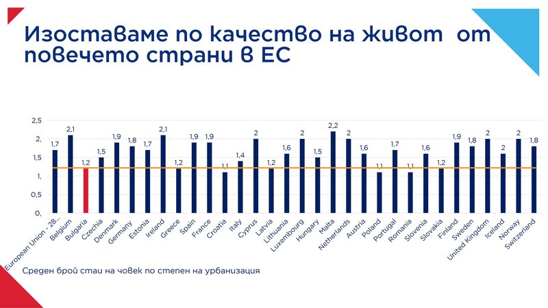 В България на човек се падат средно по 1.2 стаи, сочат други статистики, представени от Андонов. За сравнение, средно за ЕС показателят е 1.7. По стаи на човек България е на едно ниво с Гърция, Латвия, Словакия. С по 1.1 стаи на човек са Хърватия, Полша, Румъния и Словакия. В развитите европейски страни гравитират към две. Над средното ниво се открояват Белгия и Ирландия с по 2.1 стаи на човек. Най-просторно живеят жителите на Малта - с 2.2 стаи на човек.