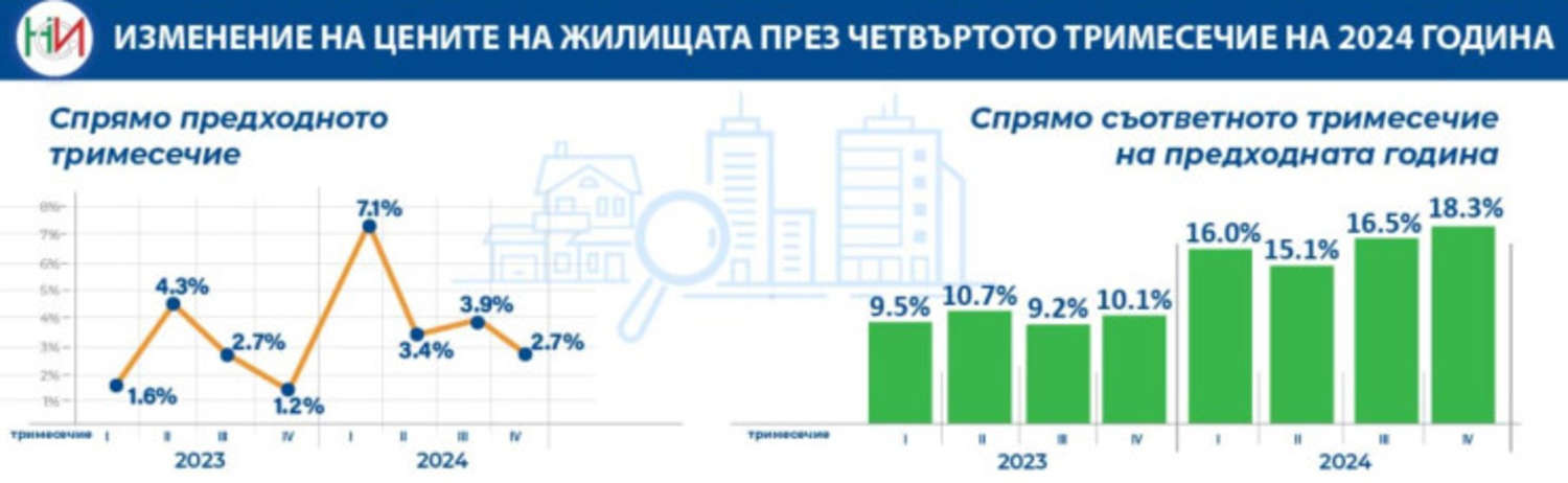 Ръстът в периода от октомври до декември е най-голямото увеличение през миналата година в сравнение с първите три тримесечия и в сравнение с 2023 г. В НСИ изчисляват, че на тримесечна база повишението на цените на жилищата е с 2,7%. Най-голямо увеличение на тримесечна база е регистрирано в Русе (8%), следвано от градовете Пловдив (5,9%), Варна (5,1%) и Стара Загора (4,5%).