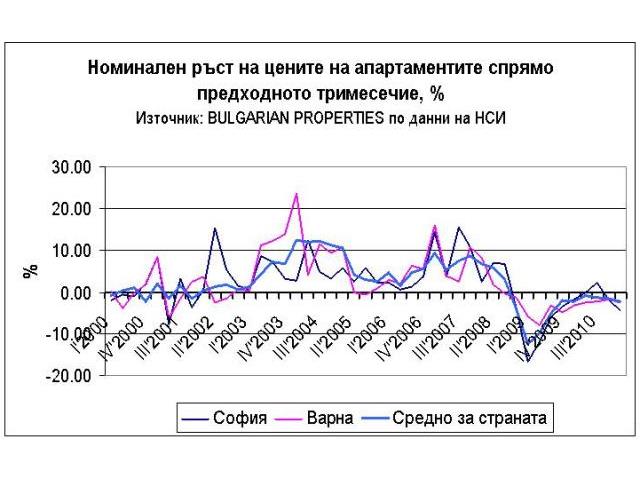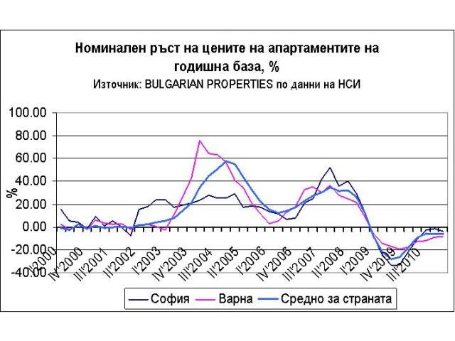 За София номиналният спад на цените е 4.42% спрямо предходното тримесечие и 3.95% на годишна база. След отчитане на инфлация цените на апартаментите в София са спаднали с 5.97% спрямо предходното тримесечие и с 8.09% спрямо същия период на миналата година.