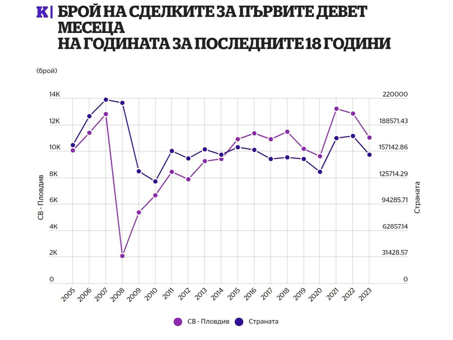 Пето поредно тримесечие в страната броят на сделките със сгради, части от тях и земеделски земи, намаляват. До края на септември тази година спадът е 12.64% за страната. В Пловдив той е малко по-висок и достига 14.2%, като за първите девет месеца на годината в местната служба по вписванията (СВ) са регистрирани 10 997 сделки. Само за третото тримесечие те са 3582, който резултат отрежда на града за първи път от 14 години третата позиция след София и Варна.