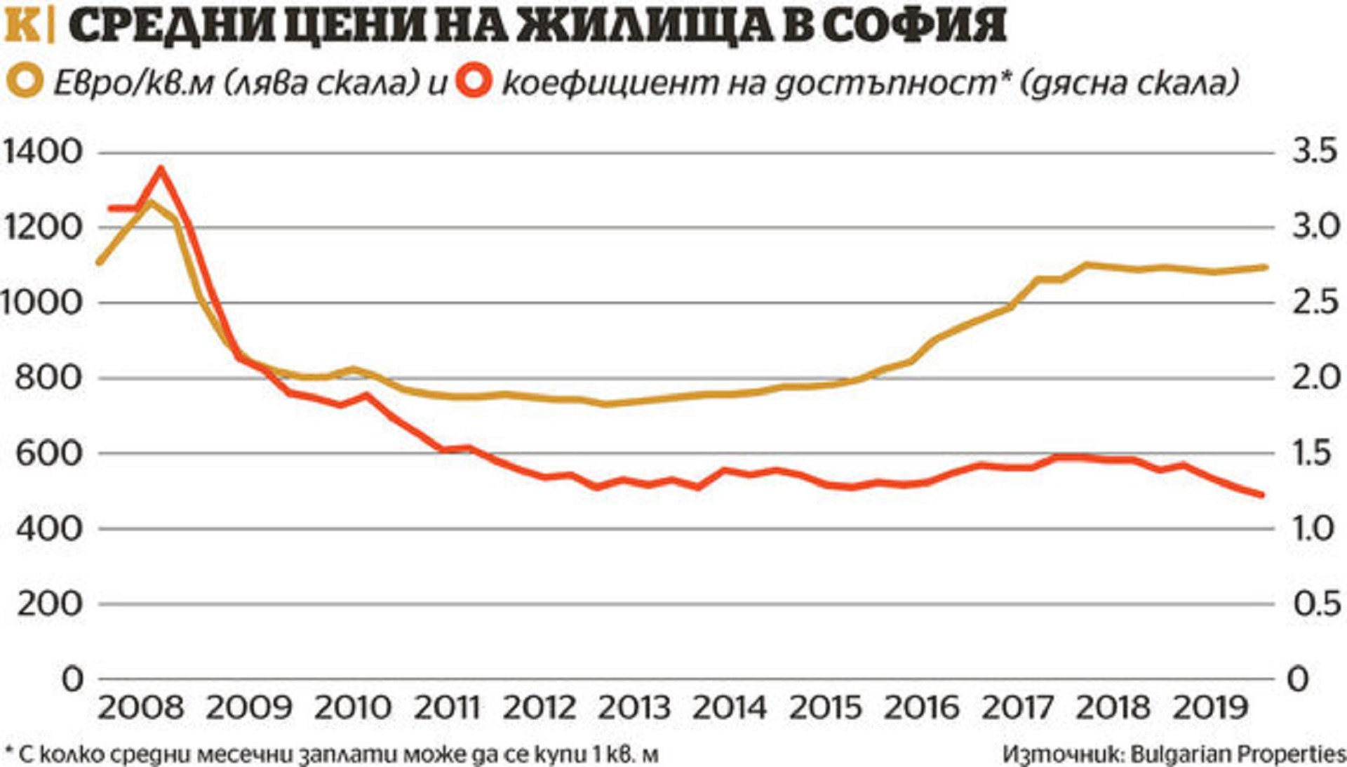 Въпреки няколкото години на ръст средните цени на жилищата в София все още са под нивата преди кризата през 2008 г. и по оценка на брокерите за имотен балон не може да се говори. По данни на "Адрес" сега средната цена е 1079 евро на кв.м, докато при предишния пик е била 1228 евро на кв.м. Според Bulgarian Properties за деветмесечието тя е 1084 евро на кв.м при 1340 евро на кв.м през 2008 г. В отделни квартали - "Овча купел" и "Младост" например, цените от 2008 г. отдавна са надминати, най-вече защото сделките тогава са били с панелни жилища, а сега има бурно ново строителство. В други райони като "Докторски паметник" и "Лозенец" по оценки на експертите докризисните нива едва ли скоро ще бъдат достигнати.
