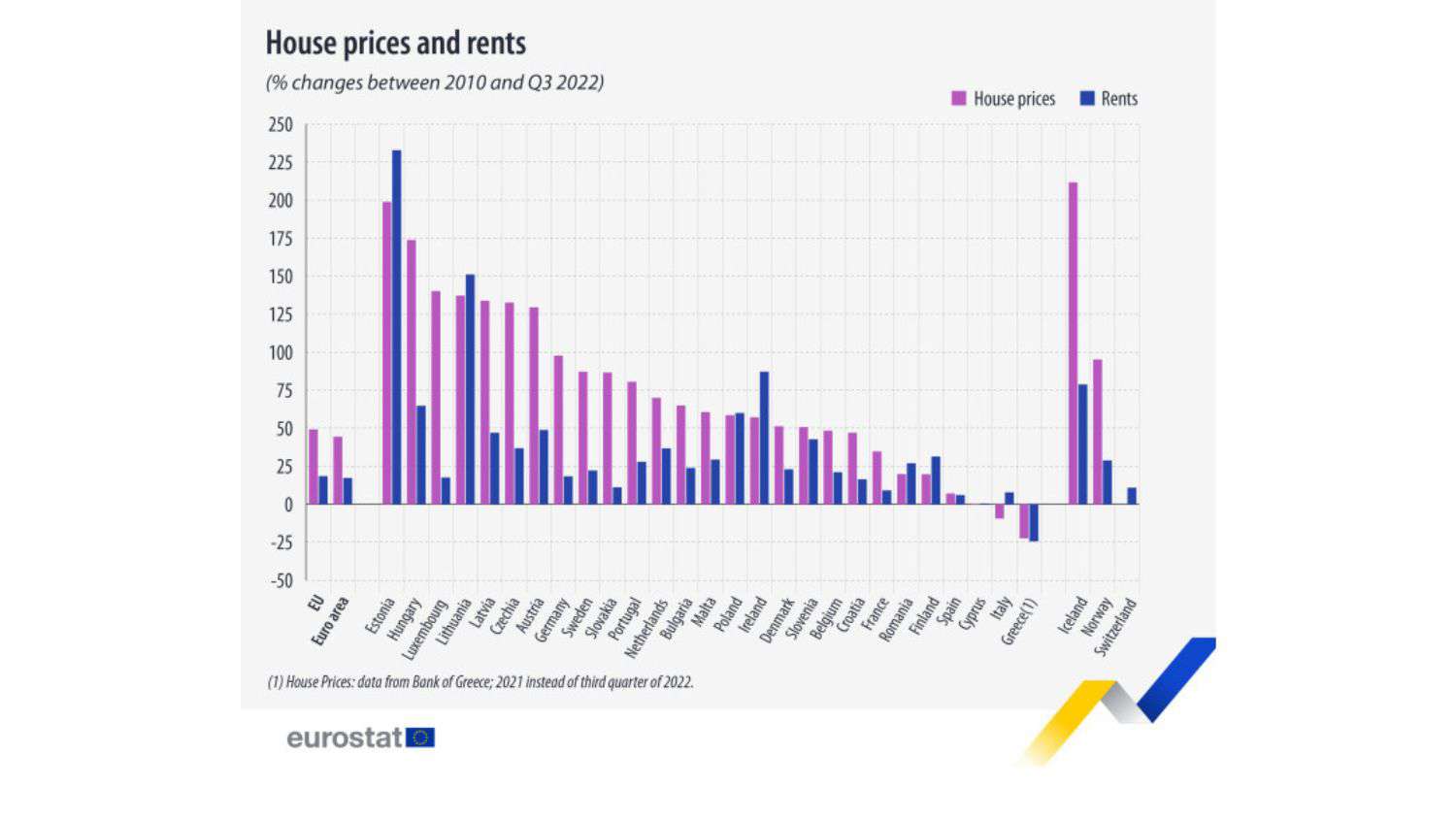 От 2010 г. до третото тримесечие на м. г. наемите са се повишили с 18 на сто, а цените на жилищата – с 49%. Цените са нараснали над два пъти в Естония, Унгария, Люксембург, Литва, Латвия, Чехия и Австрия. При сравнение между третото тримесечие на 2022 г. и 2010 г. цените на жилищата са се повишили повече от наемите в 19 страни членки на ЕС.