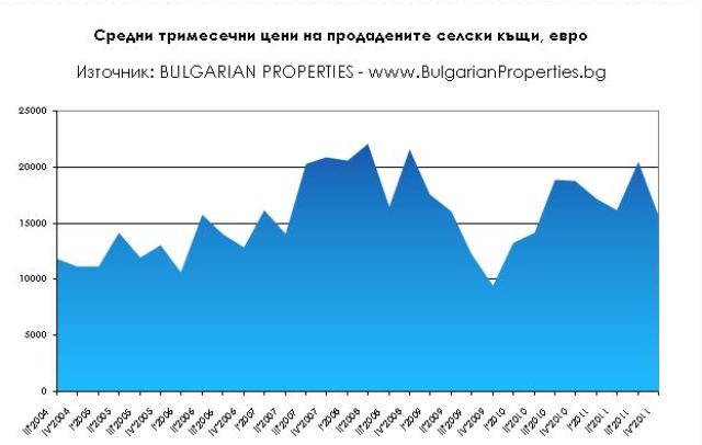 Средната цена на продадените селски къщи за тази година до момента е 15 500 евро, а миналата година за същия период е била 18 900 евро. Цената остава без изменение спрямо последното тримесечие на 2011 г., когато е била 15 600 евро. През изминалите 2 месеца се забелязва намаляване на обема на реализираните сделки със селските къщи спрямо началото на 2011 г., което се дължи основно на студената зима.
