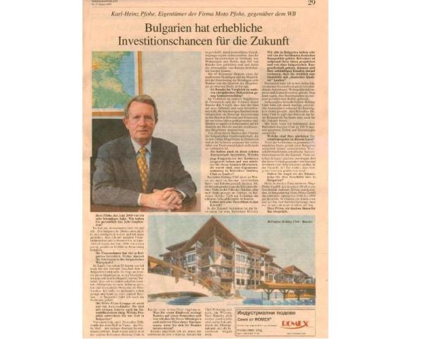 Собственикът на фирмата г-н Карл-Хайнц Пфое е един от първите инвеститори в страната и определя стабилната инвестиционна политика на компанията. За над 17 години са построени и пуснати в експлоатация десетки комплекси за продажба и сервизно обслужване на автомобили Ford, Volvo, Jaguar и Land Rover. От няколко години с името на компанията се свързва и появата на първия мол във Варна – Пфое Мол. Следващият голям инвестиционен проект е в Банско и се нарича Белведере Холидей Клуб – комплекс от затворен тип, състоящ се от луксозни апартаменти и допълнителни удобства за отдих и развлечение.