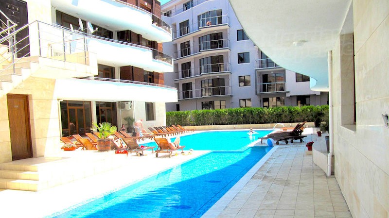 Комплексът се намира на 10 минути от плажа, а апартаментът е разположен на пети етаж, в 6-етажна сграда с удобен асансьор и басейн с детска секция в добре поддържан двор.