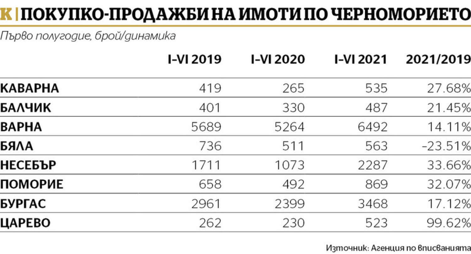 Данните на Агенцията по вписванията за 2020 г. отчитат спад в броя на сделките във всички черноморските служби с изключение на Царево (ръст 21.3%) и Балчик (ръст 3%). В Несебър, където се вписват сделките от Слънчев бряг, минусът е 17.8%. За полугодието на 2021 г. обаче картината се променя - сделките почти навсякъде са повече дори спрямо стандартната 2019 г. В Царево - двойно повече, в Поморие и Несебър - с около 33%. Спад има единствено в Бяла.