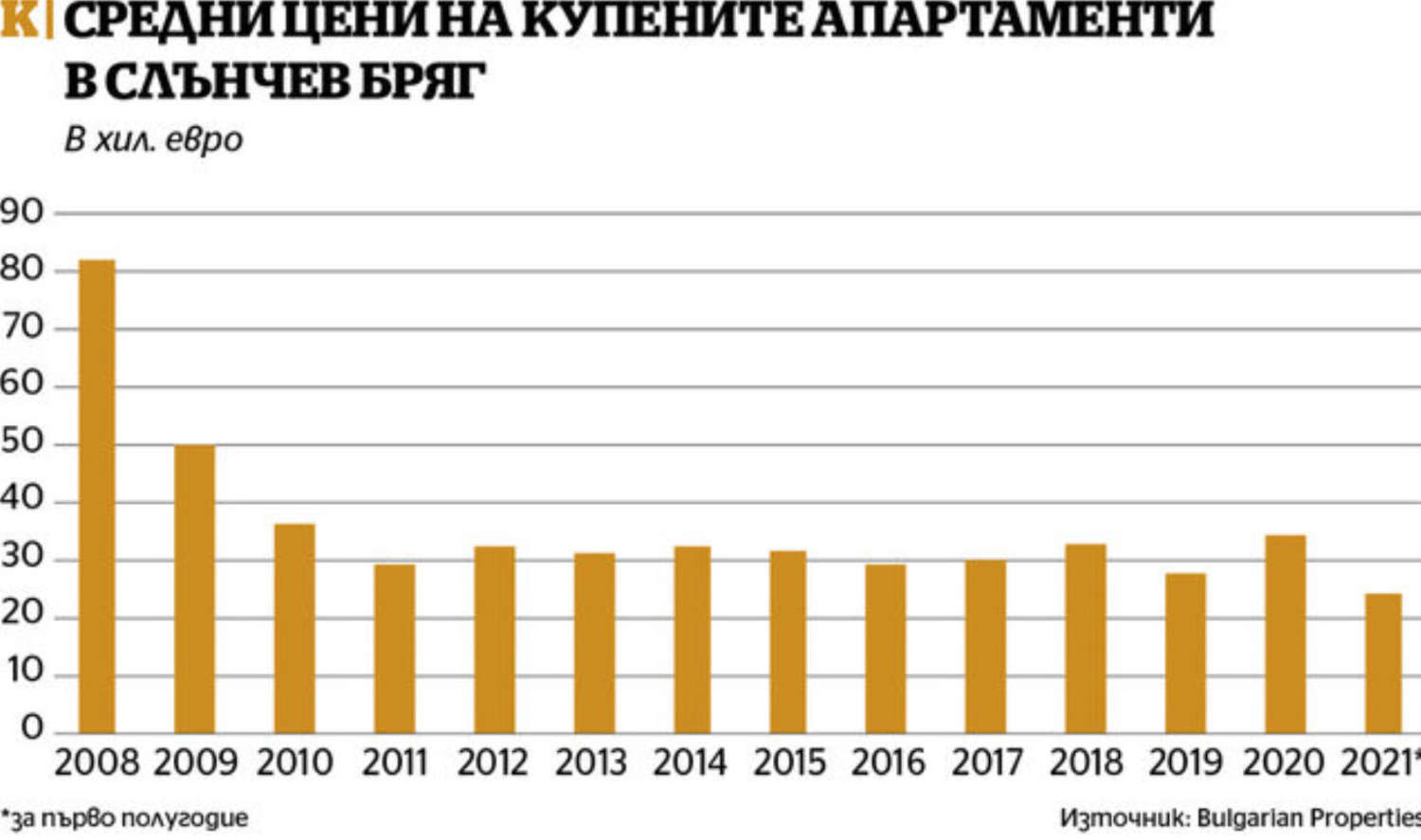 По данни на Bulgarian Properties средната цена на закупените жилища в Слънчев бряг е 25 хил. - 30 хил. евро. В Свети Влас цените и средните бюджети за покупка са около и над 35 хил. - 40 хил. евро.