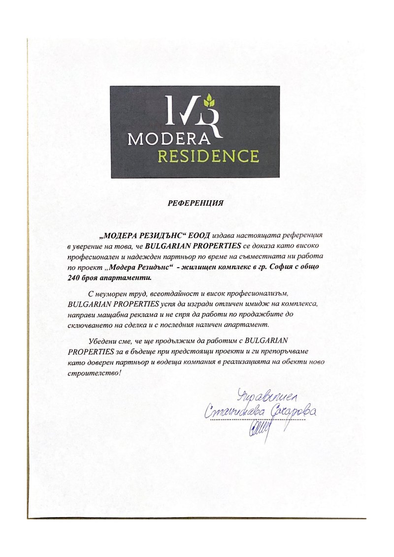 Ние бяхме ексклузивен агент по продажбите в Модера Резидънс и се погрижихме да изградим отличен имидж на комплекса, да предоставим най-доброто обслужване с внимание към всеки клиент, да имаме на разположение отговорен консултант за срещи, огледи, консултации и подкрепа във важния избор на нов дом.